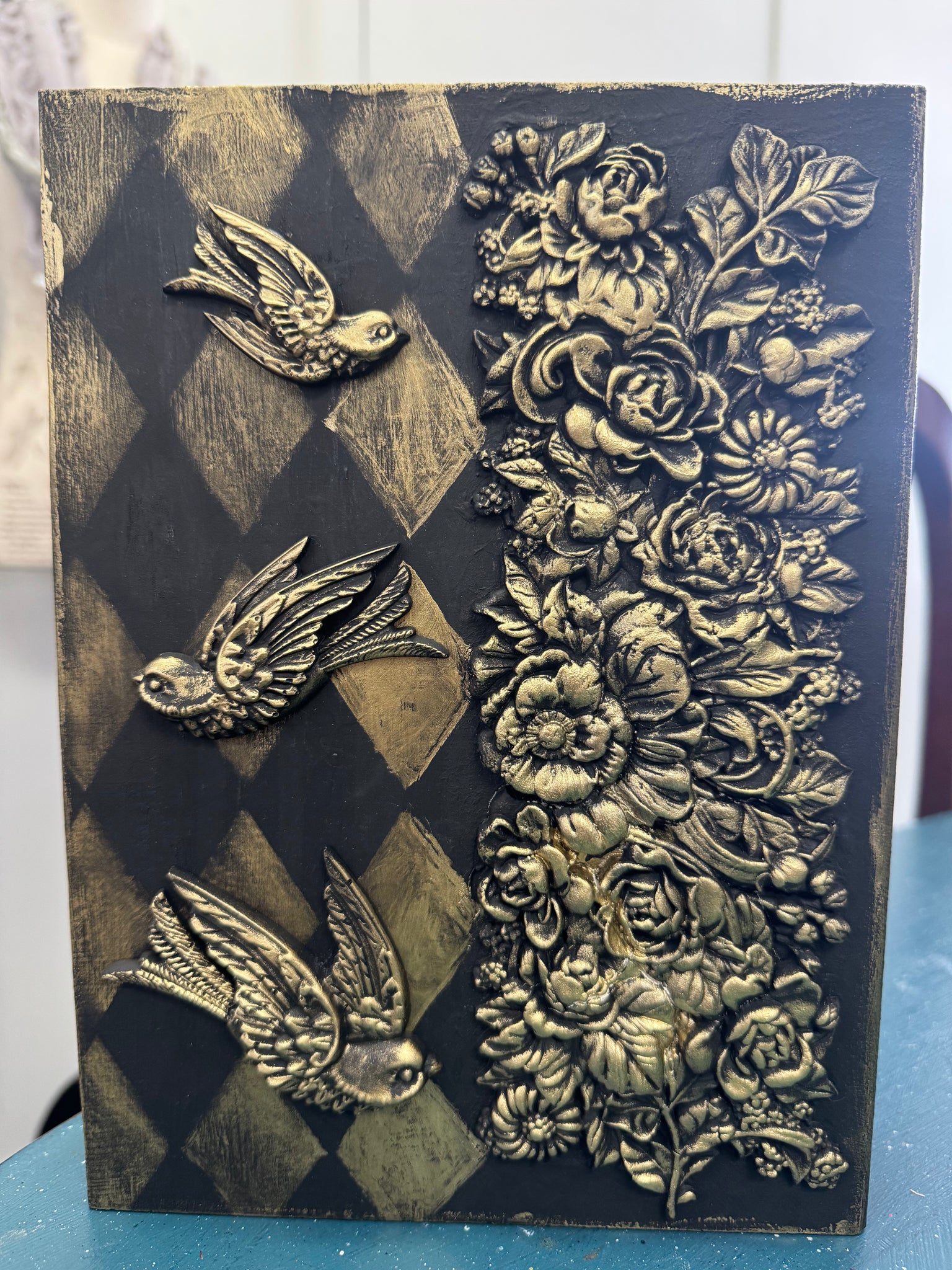 Handcrafted from timber, this striking wall piece has been created by us, using resin applicades and finished in paint and our metallic concentrate in indie gold. Its design allows for wall mounting or display on shelving, making it an adaptable accent for various interior settings. The sophisticated black and gold palette complements contemporary and traditional décor alike, adding visual interest and artisanal character to any room.