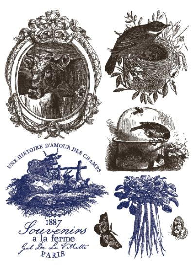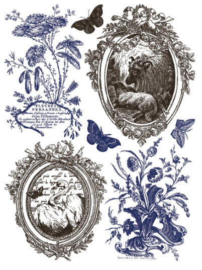 Soft distressing is intentionally built into the artwork, giving the designs a naturally aged feel from the very first use. A classic French palette of off-black, rich cobalt blue, and a deep plum-brown brings warmth and character, revealing subtle variation with each application. Thoughtfully scaled with a mix of full panels and coordinating elements, the imagery is designed to be used together on a single piece with ease.