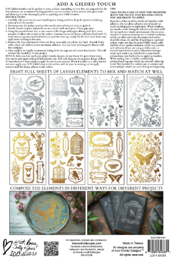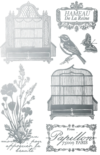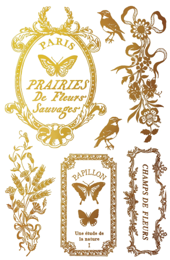 Papillon layers beautifully across a range of surfaces and can be used to create striking focal points or subtle gilded accents. The birdcages pair especially well with floral collections like Madeleine, allowing for elegant, mixed-style compositions. Whether applied to books, trays, décor pieces, or mixed-media artwork, this transfer adds a refined metallic touch that complements both vintage and modern projects.