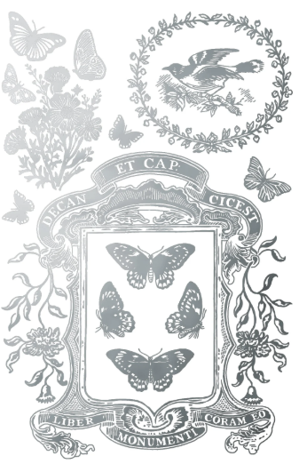 Introducing the Papillon – 8-Page 8x12" Gilded Transfer Pad—a sophisticated celebration of vintage artworks finished in a lustrous blend of gold and silver. This collection draws from 19th-century publishing ephemera, including bookplate logos, ornate motifs, labels, typography, and a charming series of birdcage illustrations. The mix of imagery blends both refined detail and playful character, all elevated by the metallic finish.