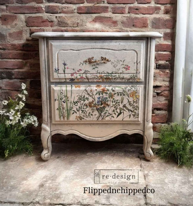 A field of wildflowers in full bloom, Maxi Décor Transfers® – Éclat Floral brings the beauty of nature to any surface. Delicate stems, lush greenery, and scattered blossoms create a soft, organic composition, perfect for adding movement and depth to furniture, home Décor, and creative projects. The watercolour effect and airy arrangement allow for effortless blending, making it easy to customize and adapt to any piece. The 12” x 12” size is ideal for medium to smaller-scale projects, offering flexibility in application.