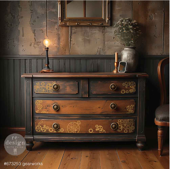 Transform your furniture and decor projects with the “GearWorks” Décor Stencil®. This versatile stencil features an array of intricate gears and mechanical elements, perfect for adding a steampunk touch to any surface. It pairs seamlessly with Finnabair’s moulds, including “Machine Parts,” “Large Gears,” and “Mechanica,” allowing you to create cohesive and stunning designs.